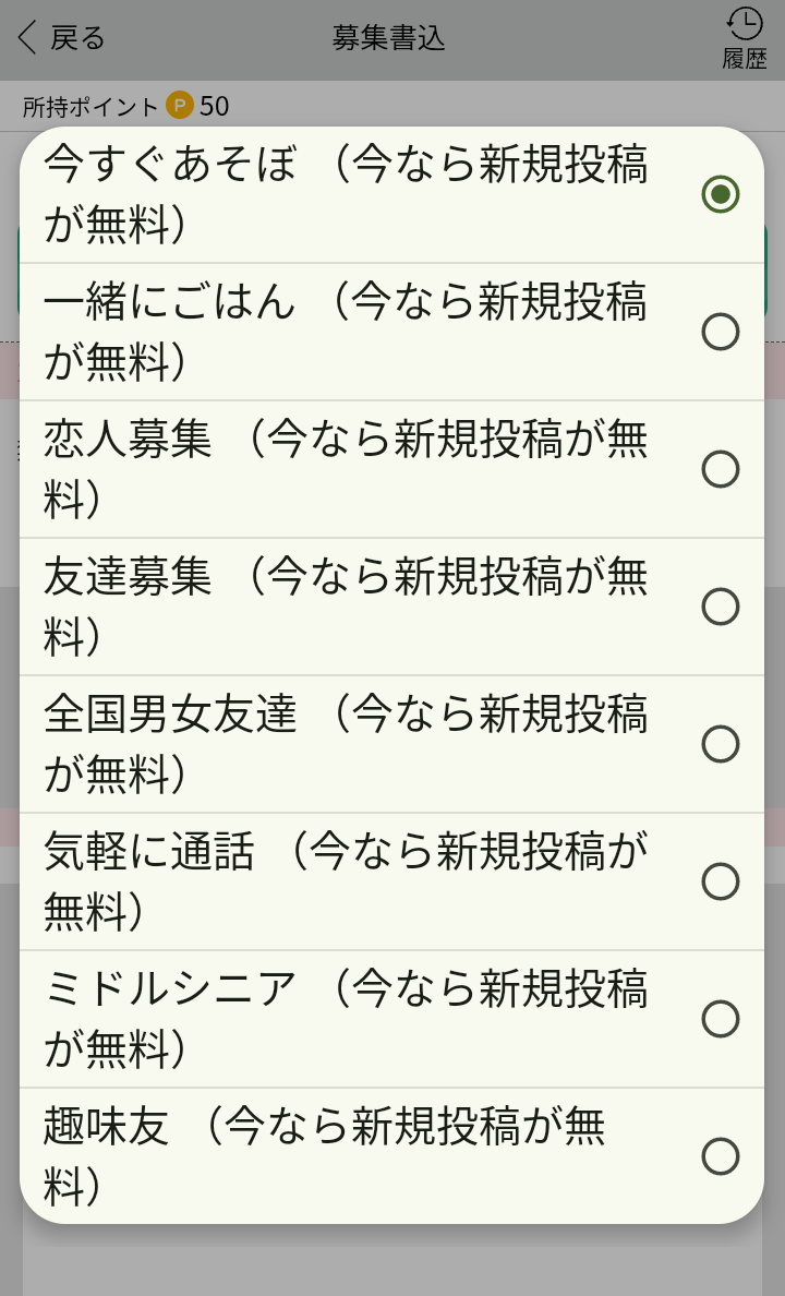 ①『恋人・友達募集』または『食事のお誘い』から募集する