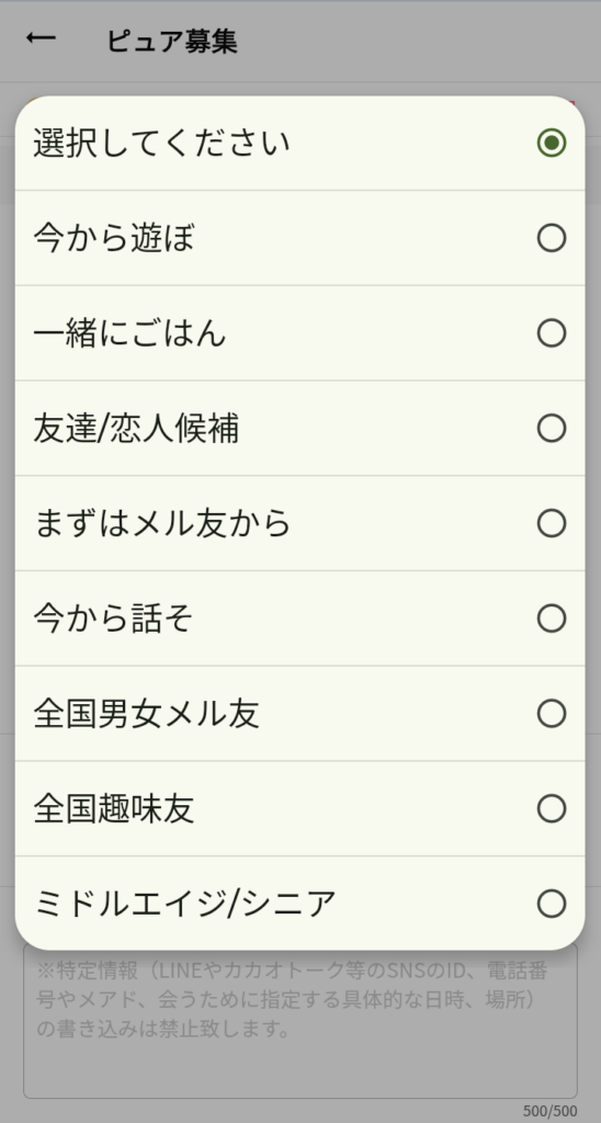 『大人の募集』はアダルト目的のため業者・サクラからのメッセージが大量に来る可能性があるため『ピュア募集』を使ってください。