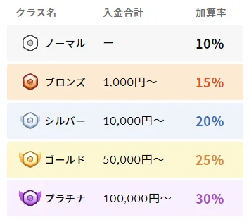 プラチナクラスになれば1万円課金で3,000円分のポイントが加算されます。